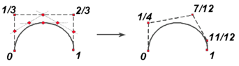 Функция insert-net сохраняет все существующие вершины многоугольника на своих позициях и вставляет определённым образом новую вершину в многоугольник, а также добавляет значение узла в узловой вектор, чтобы сохранить стандартность узлового вектора. В данном примере новая вершина была вставлена посередине между второй и третьей вершиной, и было добавлено новое значение узла 0.5. (Заметьте, что в FastShip новый узловой вектор будет иметь вид {0,0,0,0,1,2,2,2,2} т.к. FastShip поддерживает интегральные значения узлов). Теперь, если мы будем использовать уже изученные приёмы для вычисления значения кривой с дополнительным контролем, то обнаружим, что она слегка отличается от исходной кривой. Но мы же дополнительно проконтролировали поверхность. Секрет здесь в том, что команда insert-net не сохраняет форму кривой, но сохраняет стандартность узлового вектора.