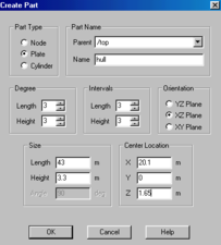В графе "Part Type" выберем пункт "Plate", т.к. мы хотим иметь плоский лист. В графу "Name" впишем hull. При дальнейшей работе эта часть поверхности в дереве деталей будет обозначаться именно так. Что касается степени поверхности, то мы хотим, чтобы наша поверхность имела кривизну в обоих направлениях, поэтому в графе "Degree" оставим цифры 3, т.е. поверхность будет третьей степени; квадратичными поверхностями труднее манипулировать, а поверхности 4ой степени не дают больших преимуществ. В "Intervals" поставим цифры 3; начнём с поверхности, имеющей 3 интервала, впоследствии количество интервалов можно будет изменить. Лист будет располагаться в плоскости XOZ при Y=0, т.е. в "Orientation" выберем именно эту плоскость. В графе "Size" выберем соответствующие размеры разрабатываемой части судна. Центр тяжести листа будет располагаться при X=20.1 Y=0 Z=1.65, т.к. начало отсчёта мы хотим совместить с нулевым шпангоутом.