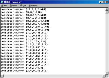 Макрос можно создать в любом текстовом редакторе, который содержит тип файлов macro (расширение .mac). Если выбранный текстовый редактор не содержит указанного типа, то с помощью операционной системы следует загрузить этот тип файлов. В данной работе для создания макроса был использован текстовый редактор ‘Блокнот’. Для отображения маркера на экране в FastShip существует команда Construct-marker. При этом если маркер имеет координаты (x;y;z), то команда выглядит следующим образом: Construct-marker {x;y;z}. Записав таким образом эту команду для каждой ординаты (см.рис.) и сохранив его с расширением .mас, получим нужный макрос.