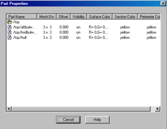 Перед сглаживанием поверхности целесообразно увеличить плотность контрольной сетки, чтобы программа в процессе сглаживания высчитывала большее количество точек. Увеличить плотность сетки можно выбрав из меню ’Parts’ подменю’Properties’. В открывшемся диалоговом окне (рис.4.18.) нужно выделить поверхность, плотность которой нужно увеличить и нажать на вкладке ‘Mesh Div’. Появится следующее диалоговое окно, в котором можно задать плотность сетки по столбцам и по рядам (рис.4.19.).
