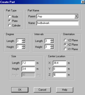 Находясь в файле готовой поверхности, из меню’Parts’ выбрать пункт ’Create’. В открывшемся диалоговом окне указать параметры плоского листа, из которого в дальнейшем будет получена поверхность юта или бака.