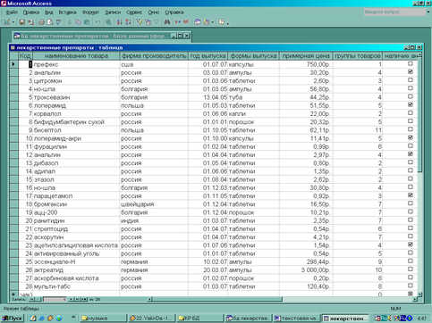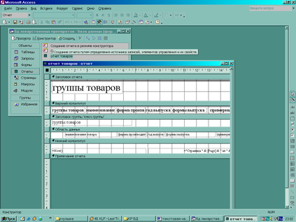 Воспользуемся функцией «Создание отчета с помощью мастера». Для удобного восприятия информации о лекарственных препаратах выберем поля: группы товаров (из таблицы «Группы товаров»), а также наименование товара, фирма производитель, год выпуска, формы выпуска, примерная цена (из таблицы «Лекарственные препараты»). Получим удобную форму «Отчеты» для вывода информации о лекарственных препаратах на принтер и визуального восприятия без излишней (бесполезной) информации.