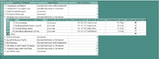 Установим связь между таблицей «Группы товаров» и таблицей «Лекарственные препараты». Выберем команду Сервис > Схема данных. Установим связь между полем «ключ группы» таблицы «Группы товаров» и полем «группы товаров» таблицы «Лекарственные препараты».