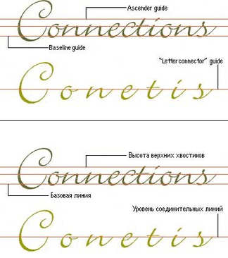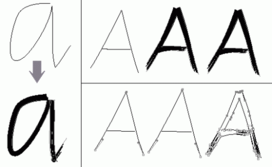 На первый взгляд, мы не можем изобразить букву простым контуром, без заливки. Но большинство программ позволяют преобразовать контур в объект с заливкой, сохранив при этом его форму и толщину, и даже имитацию нажима пера! Это опция называется "Convert lines to shapes" или "Expand stroke". Если контур замкнут, мы в итоге получим объект из двух скомбинированных объектов, не имеющий контура и с заливкой. Ник Куртис, из Nick's Fonts fame, использует этот способ очень часто при создании своих симпатичных шрифтов.