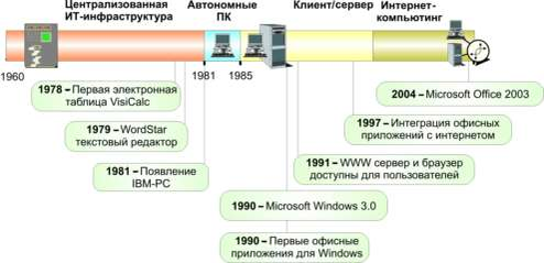 Кратко поясним содержание этих этапов. С середины 60-х годов электронно-вычислительные машины начинают использоваться в бизнесе. Это были большие, громоздкие и очень дорогие компьютеры, доступные весьма ограниченному кругу лиц. Располагались они в специальных помещениях - вычислительных центрах. Пользователи получали в свое распоряжение выносную клавиатуру и экран - терминал, который позволял вести диалог с центральным компьютером. При этом терминал был только средством для ввода/вывода данных, а вся вычислительная мощность была сосредоточена в центральном компьютере (мэйнфрейме). Отсюда и название этого этапа - "централизованная ИТ-инфраструктура".