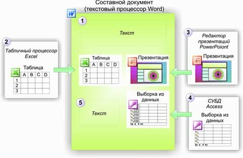 За счет интеграции приложений Microsoft Office пользователи пакета могут создавать весьма сложные составные документы, содержащие данные из различных приложений. Способ обмена данными между приложениями Microsoft Office (механизм связывания и внедрения объектов) предоставляет пользователю возможность вставлять в документ, созданный в одном приложении, фрагменты, созданные в других приложениях.