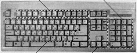 Известно два типа клавиатур – клавиатура с механическими и мембранными переключателями. Переключатель первого типа это обычный механический датчик, традиционное устройство известное уже несколько десятилетий. Второй тип датчика устроен несколько сложнее. Переключатель данного типа представляет из себя набор мембран, при нажатии на клавишу верхняя мембрана прогибается и через специальное отверстие в изолирующей мембране замыкается на нижнюю мембрану. Предпочтение отдается клавиатуре с механическими датчиками. Они выдерживают многолетнюю эксплуатацию, надежны и поддаются ремонту в случае необходимости. Рис. Группы клавиш стандартной клавиатуры
