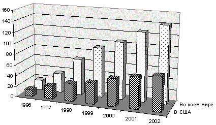 На 2002 г. к глобальной компьютерной сети Интернет подключены пользователи из более 120 государств мира. По некоторым оценкам, в 1996 г. экономическую деятельность в информационной среде глобальной компьютерной сети Интернет осуществляли более 111 тыс. компаний, в 2001 г. их число превысило 500 тыс., а количество Web-сайтов в сети Интернет превышает 5 млн.