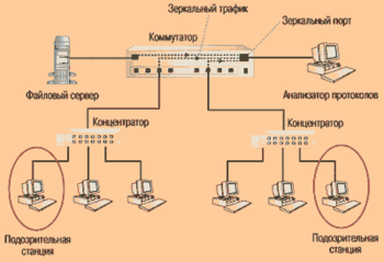 Если в коммутаторе специальный порт отсутствует, то анализатор (или агент) следует подключать к портам интересующих доменов сети в максимальной близости к наиболее подозрительным станциям или серверу (см. рисунок 3.6 ). Иногда это может потребовать использования дополнительного концентратора. Данный способ предпочтительнее первого. Исключение составляет случай, когда один из портов коммутатора работает в полнодуплексном режиме. Если это так, то порт предварительно необходимо перевести в полудуплексный режим.