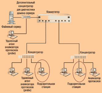 Если сеть имеет архитектуру с компактной магистралью (collapsed backbone) и в качестве магистрали используется коммутатор, то анализатор необходимо подключать к тем портам коммутатора, через которые проходит анализируемый трафик. Некоторые программы имеют специальные агенты или зонды (probes), устанавливаемые на компьютерах, подключенных к удаленным портам коммутатора. Обычно агенты (не путать с агентами SNMP) представляют собой сервис или задачу, работающую в фоновом режиме на компьютере пользователя. Как правило, агенты потребляют мало вычислительных ресурсов и не мешают работе пользователей, на компьютерах которых они установлены. Анализаторы и агенты могут быть подключены к коммутатору двумя способами.