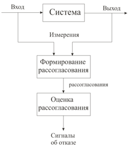 Формирование рассогласования: этот блок формирует сигналы рассогласования с использованием доступных входов и выходов, системы за которой осуществляется мониторинг. Эти рассогласования (или симптомы отказа) должны выступать индикаторами возникновения отказа в системе. Они должны быть равны нулю или близки к нему по величине при отсутствии отказов, и значительно отличаться от нуля при наличии отказов. Это значит, что в идеальных условиях, рассогласованию характерна независимость от входов и выходов процесса.