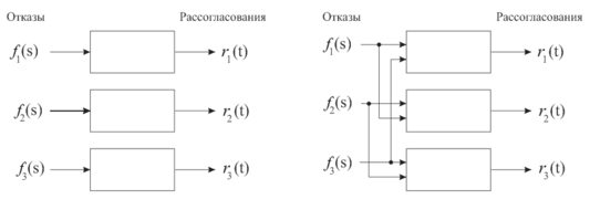 где Ti (i=1,2 … g) – пороги. Эта структура изолируемых рассогласований очень проста, все отказы могут выявляться одновременно, однако для проектирования на практике эта схема сложна. Даже когда такая совокупность рассогласований может быть спроектирована, обычно при этом не остается свободы проектирования для выполнения других требований, например, устойчивости к ошибкам моделирования.