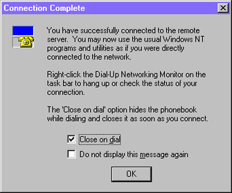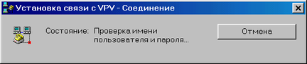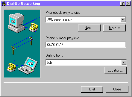 Теперь можно подключиться к PPTP серверу. В окне Dial-Up Networking выбираем запись для подключения к PPTP серверу и нажимаем «Dial». После проверки имени и пароля появляется окно: