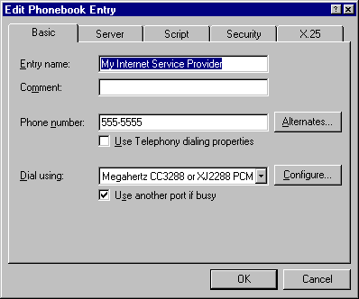 В следующем окне выбираем модем, нажимаем «Next». Далее появляется окно, в котором мы вводим телефонный номер провайдера, нажимаем «Next». Новая запись сделана. Можно редактировать запись нажав «More», «Edit entry and modem properties». Появиться окно с открытой закладкой «Basic»: