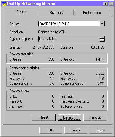 В правом углу «Панели задач» появляется значок Dial-Up Networking Monitor. Если щёлкнуть на него, появиться окно: