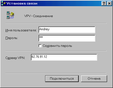 Дважды щёлкаем на значок с нашим VPN-соединением. В появившемся окне вводим имя и пароль и нажимаем «Подключиться»: