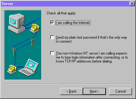 Запускаем программу Dial-Up Networking (Start, Accessories). В появившемся окне вводим имя новой записи и нажимаем «Next». Во вновь появившемся окне выбираем I am calling the Internet и нажимаем «Next»: