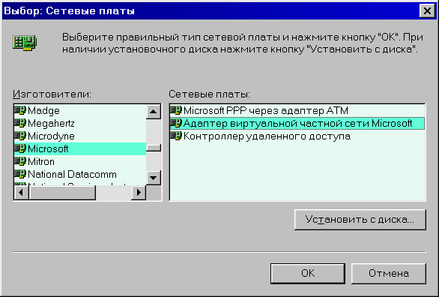 Сначала необходимо установить адаптер виртуальной частной сети Microsoft. В «Панели управления» дважды щелкаем на папку «Сеть». Затем нажимаем кнопку «Добавить», выбираем тип устанавливаемого устройства – Сетевая плата и снова нажимаем «Добавить». В появившемся окне выбираем Изготовитель: Microsoft, Сетевая плата: Адаптер виртуальной частной сети Microsoft. Так же необходимо установить «Контроллер удалённого доступа»: