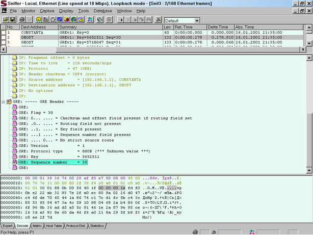 Для того чтобы просмотреть в каком виде передаются данные по протоколу PPTP использовался анализатор сети Sniffer Pro 2.5 (рисунок 57).