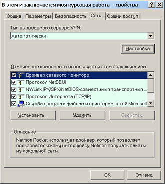 Закладка «Сеть». Здесь можно выбрать тип вызываемого сервера VPN: Автоматически, Туннельный протокол точка-точка (PPTP) и туннельный протокол второго уровня (L2TP). Так же имеется список доступных для использования сетевых компонентов.