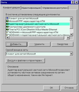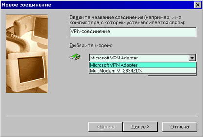 Microsoft Windows 9x имеет весьма скромные возможности для создания VPN-соединений по сравнению c Windows NT и тем более с Windows 2000. Здесь можно работать только в качестве PPTP клиента.