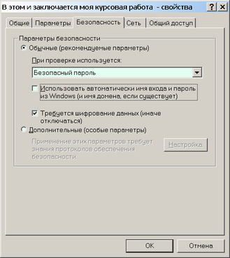 Закладка «Безопасность». Здесь у нас имеется два пункта «Параметров безопасности»: «Обычные» и Дополнительные».