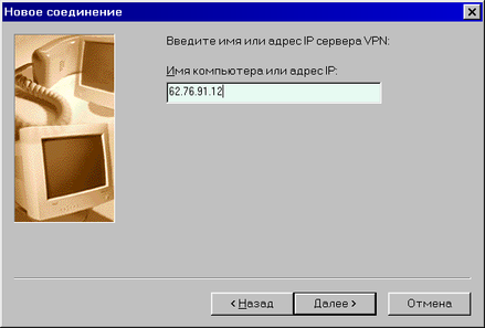 Во вновь появившемся окне вводим IP-адрес VPN-сервера: