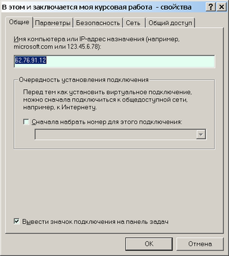 Закладка «Общие». Здесь можно указать IP-адрес компьютера, с которым мы будем устанавливать VPN-соединение, а так же указать номер телефона: