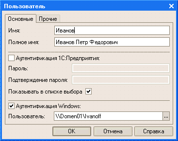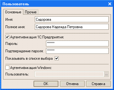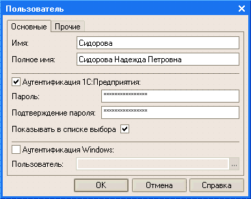 Администратор информационной базы имеет возможность добавлять, удалять пользователей, а также модифицировать данные пользователя. Создание новых пользователей возможно также путем копирования уже существующих пользователей.