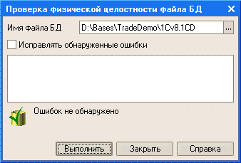 Утилита предназначена для автономной проверки и исправления файловой базы, данных без запуска конфигуратора. Важно, чтобы выбранная для проверки информационная база не была открыта в режиме Конфигуратора или 1С: Предприятия.