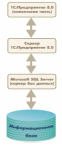 На одном из компьютеров работает сервер 1С: Предприятия 8.0. Программа, работающая у пользователя, взаимодействует с сервером 1С: Предприятия 8.0, а сервер при необходимости обращается к базе данных MS SQL Server. При этом физически сервер 1С: Предприятия 8.0 и MS SQL Server могут располагаться как на одном компьютере, так и на разных. Это позволяет администратору при необходимости распределять нагрузку между серверами. Использование сервера 1С: Предприятия 8.0 позволяет сосредоточить на нем выполнение наиболее объемных операций по обработке данных. Например, при выполнении даже весьма сложных запросов программа, работающая у пользователя, будет получать только необходимую ей выборку, а вся промежуточная обработка будет выполняться на сервере. Обычно увеличить мощность сервера гораздо проще, чем обновить весь парк клиентских машин.