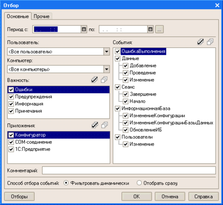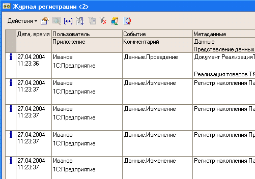 Журнал регистрации содержит информацию о том, какие события происходили в информационной базе в определенный момент времени или какие действия выполнял тот или иной пользователь: