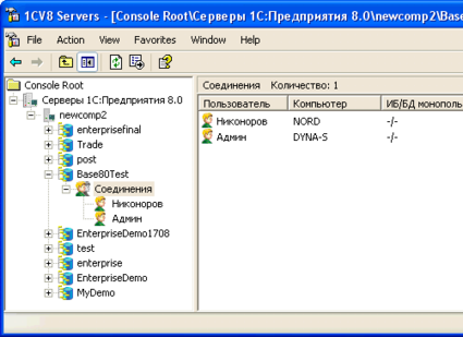 Развертывание клиент-серверного варианта и его администрирование выполняется довольно просто. Например, создание базы данных производится непосредственно в процессе запуска конфигуратора (так же, как и для файлового варианта). В поставку системы входит средство администрирования клиент-серверного варианта работы, позволяющее администратору управлять информационными базами и подключением пользователей.