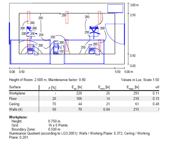 Відповідно до нормативу ДНАОП 0.00-1.31-99 освітленість повинна перебувати в межах 300-500 Лк. З вище наведеної схеми розподілу освітленості в приміщенні бачимо, що все в нормі.