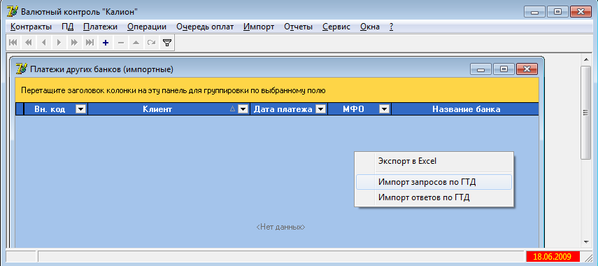 Для того, щоб сформувати платежі по ВМД, які передані на контроль до інших банків потрібно перейти по меню «Отчеты\Ответы по Импортным (Экспортным) ГТД». Таким чином ми потрапимо до відображення таблиці платежів інших банків. Далі, якщо формування буде йти в автоматичному режимі в результаті імпорту файлів «Запитів» потрібно вибрати пункт в контекстному меню «Импорт запросив по ГТД». (рисунок 5.3).