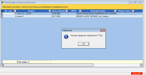 Процес імпорті відповідей від банку дуже схожий на імпорт запитів. Якщо файл проходить всі перевірки, то на зв’язках «Платіж-ПД» проставляється дата підтвердження даного платежу. (поле «Дата підтвердження ВМД» з рисунку 5.8). При цьому система видасть повідомлення з кількістю опрацьованих зв’язків (рисунок 5.9).
