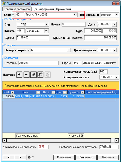 При вище описаних діях в системі створюється зв’язки між платежем та ПД. Наглядно можемо побачити це з рисунку 5.6. В другому рядку маємо ПД з номером 6 та сумою 24563. Якщо відкрити цей ПД (шлях меню «ПД/Експортні ПД») то ми побачимо зв'язок з цим платежем та оплату на цю суму (рисунок 5.8).