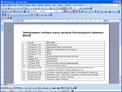 Приложение 8. Пример отчета по электронным учебным курсам, написанным авторами белгородского филиала МЭСИ