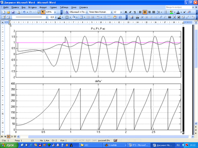 Рисунок 8 – Осциллограммы мощности турбины, синхронной мощности, асинхронной мощности и угла