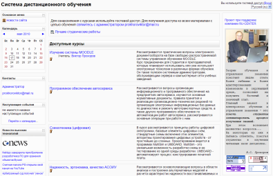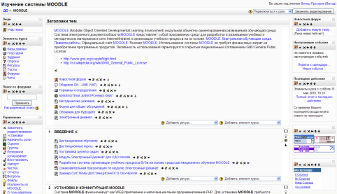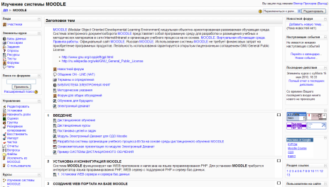 Прежде чем создавать новый курс, познакомимся с интерфейсом программы на существующем сайте «Система дистанционного обучения», размещенном по адресу http://prokhoroviktor.ru/. Зайдите на этот сайт, в перечне дистанционных курсов найдите «Изучение системы Moodle», и кликните по этой ссылке.