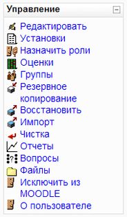 Она нужна для перехода в режим редактирования. Эта кнопка доступна только тем пользователям, у которых есть права редактировать и изменять материалы курса (администратору, создателю курса, преподавателю с правом редактирования). При нажатии на кнопку «Редактировать» меняется интерфейс, в каждом блоке у объектов, которые можно редактировать, появляются кнопки инструментов, позволяющих изменять содержание и вид этого объекта (блока, ресурса, элемента курса, темы и т.д.). В режим редактирования можно перейти и с помощью пункта меню Редактировать в блоке «Управление». В левой колонке появился блок «Управление».