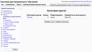 Для удобства ориентации в большом количестве создаваемых курсов, в Moodle предусмотрена структуризация их по категориям и подкатегориям. Поэтому при создании курса следует указать, к какой категории (подкатегории) будет относиться данный курс, если подходящей категории не существует — создать ее.