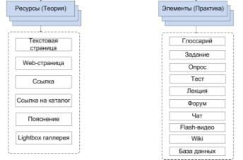 Можно разделить инструменты (модули) Moodle для представления материалов курса на статические (ресурсы курса) и интерактивные (элементы курса).