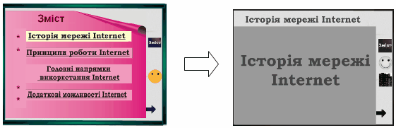 Зміст складається з чотирьох пунктів. Щоб розпочати навчання, потрібно клацнути на вибраному пункті, після чого з’явиться оголошення даного пункту (Рис. 5.3). І, користуючись кнопками (вперед, назад), можна листати слайди.