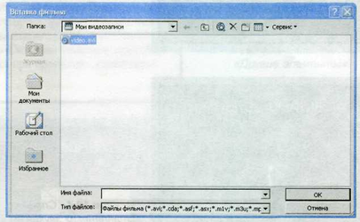 Для вставки до слайду відеозображення в меню "Вставка" обрати пункт "Вставка", а в ньому підпункт "Фильм из файла". Відкриється вікно "Вставка фильма" (мал. 19.1).