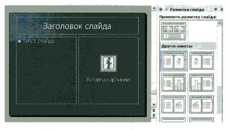 Для вставки до слайду графічного об'єкта (малюнок, фотографії) потрібно створити новий слайд і обрати у вікні "Разметка слайда" авторозмітку "Заголовок, текст и графика". Відкриється слайд виду, що показаний на (мал.18.1).
