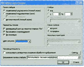 Створивши презентацію, ви можете запустити її демонстрацію, клацнувши по кнопці "Показ слайдов". Обрати в меню "Показ слайдов" пункт "Настройка презентации". Відкриється вікно "Настройка презентации" (мал.24.1).