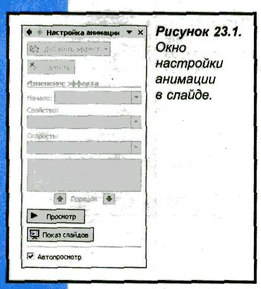 Крім переходу між слайдами, можна настроїти анімацію вміщуючого слайдів. В меню "Показ слайдов" обрати пункт "Настройка анимации". В області задач відкриється вікно "Настройка анимации" (мал.23.1).