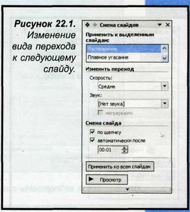 Клацнувши по кнопці "Показ слайдов" ви переходите до режиму демонстрації слайдів. Кожне нове клацання мишею буде викликати перехід до наступного слайду. Для того щоб зробити перехід від слайда до наступного слайду видовищним, необхідно зробити настройку переходів. Для цього потрібно перейти до режиму "Сортировщик слайдов" і клацнути правою кнопкою миші по першому слайді. У контекстному меню потрібно обрати пункт "Смена слайда". В області задач відкриється вікно "Смена слайдов" (мал.22.1).