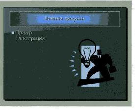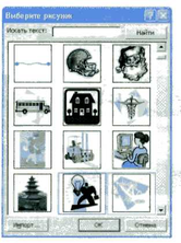 Скопіюйте до нового слайду заголовок із попереднього слайду та виправте його текст на: "Вставка графики". Текстове поле можна видалити або набрати в ньому текст до ілюстрації. Наприклад: Приклад ілюстрації. Потім двічі клацнути по піктограмі ілюстрації. Відкриється вікно "Выберите рисунок" (мал.18.2) із колекцією графічних зображень.